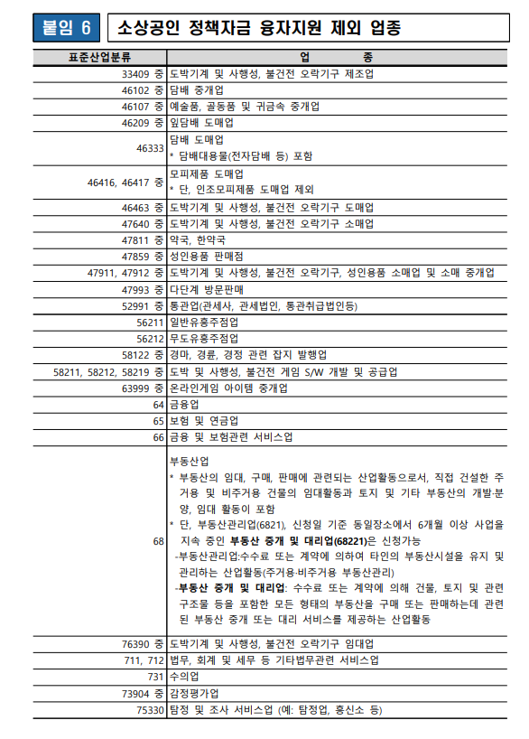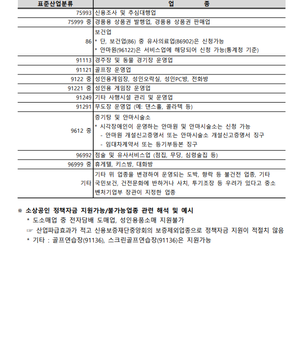 (1) 사행성 업종, 변호사, 회계사, 병원, 약국 등의 전문직 직종, 금융, 보험 관련 업종 등 소상공인 정책자금 융자 제외 업종