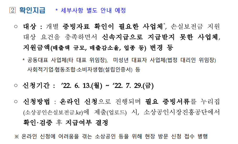 (2) 확인 지급 : 개별 증빙자료 확인해야 하는 경우나 지원기준에 부합하나 신속 지급에 포함되지 않은 사업체, 지원금액이 변경된 경우는 6월 13일(월)부터 지급됩니다.