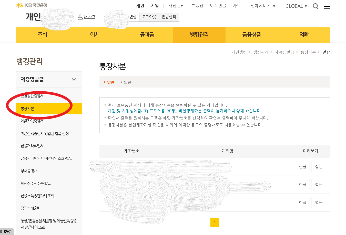 KB국민은행> 홈페이지 > 뱅킹 관리 > 증명서> 통장사본 출력 > 통장사본 출력 서비스